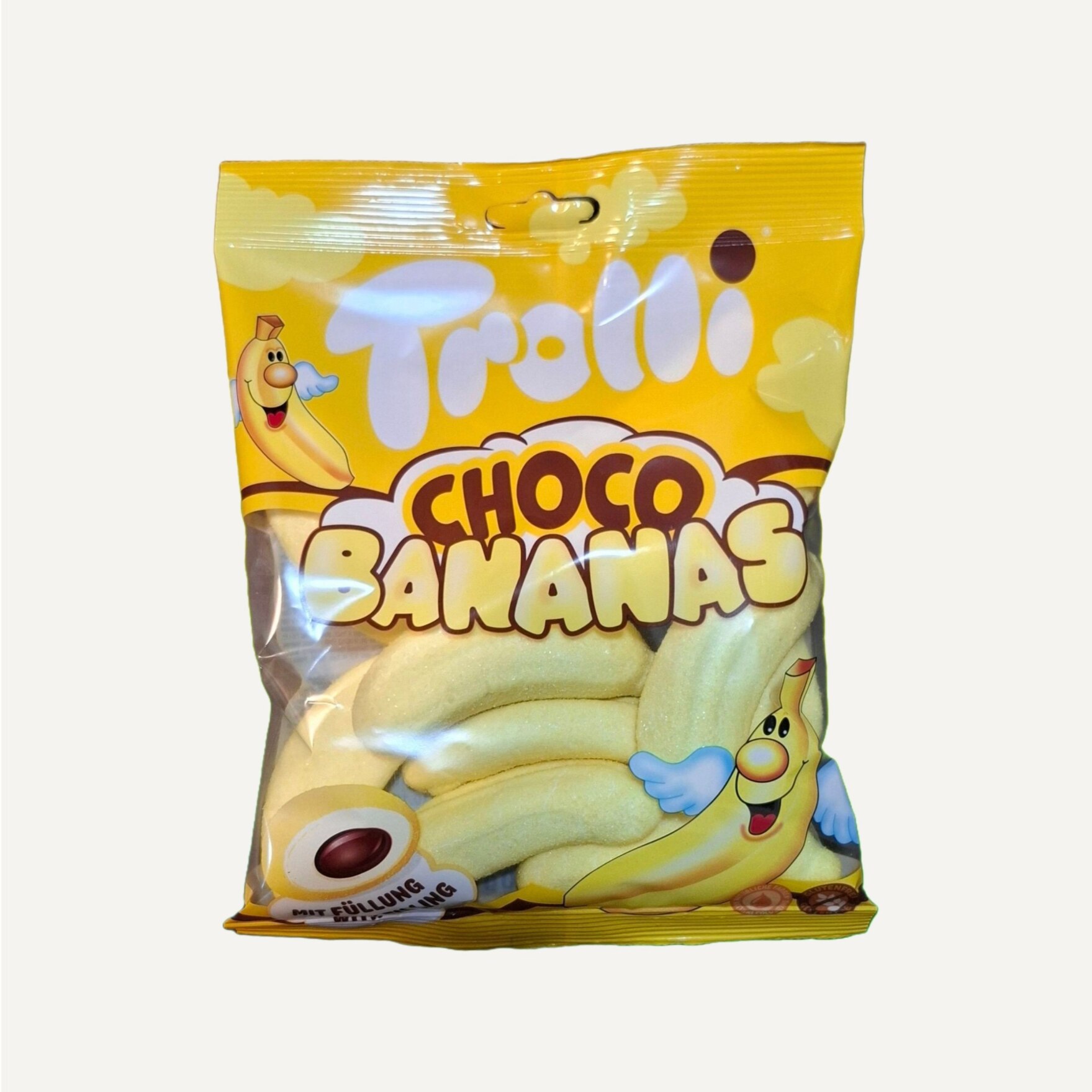 مارشمالو ترولی Choco bananas (چوکو باناناس) 150 گرم یک شیرینی جویدنی جذاب و منحصر به فرد است که ترکیب طعم موز و شکلات را در یک بافت نرم و ابری ارائه میدهد. این محصول به شکل موزهای کوچک و بامزه طراحی شده که درون هر کدام از آنها یک محفظه خامه شکلاتی غلیظ و لذیذ قرار دارد . این مارشمالو با بافت پفدار و نرم خود، یک تجربه دلچسب برای همه اعضای خانواده، به ویژه کودکان و نوجوانان ایجاد میکند و انتخابی ایدهآل برای میانوعده، مهمانیها و تهیه دسرهای خلاقانه است.